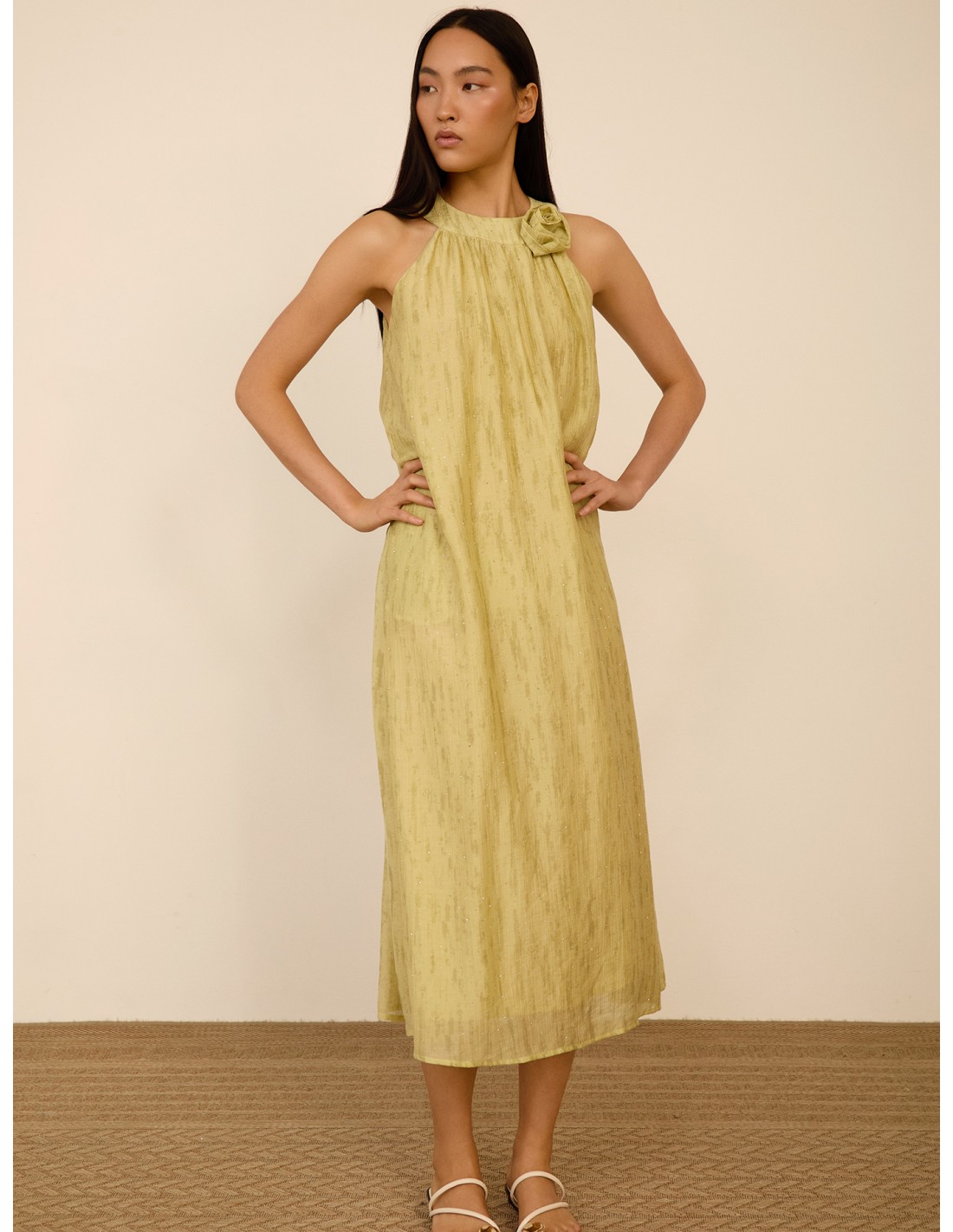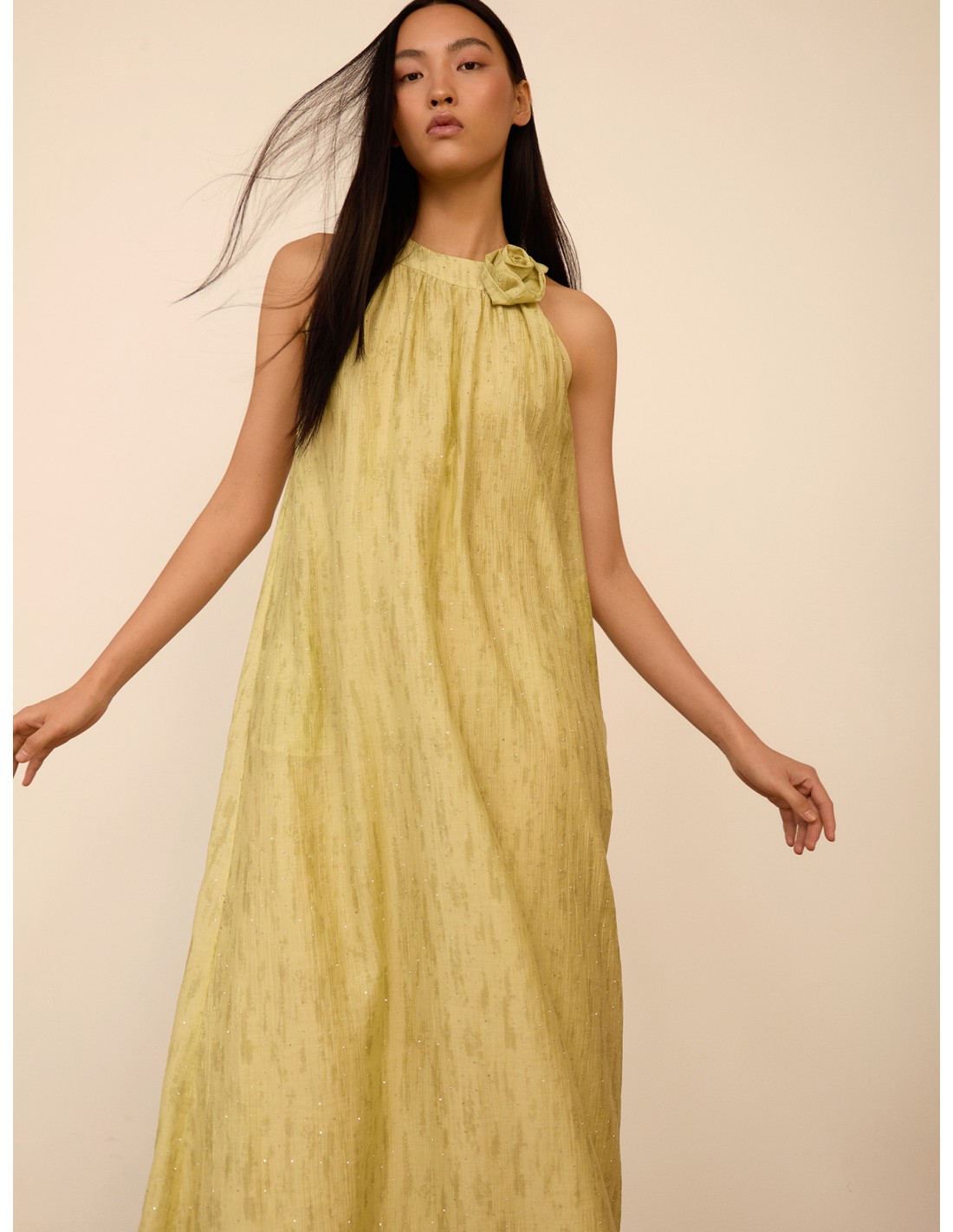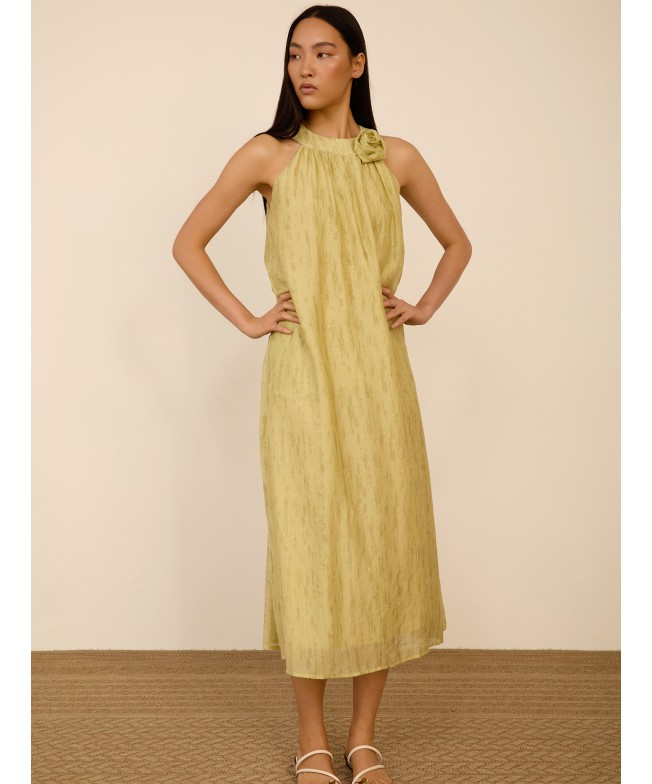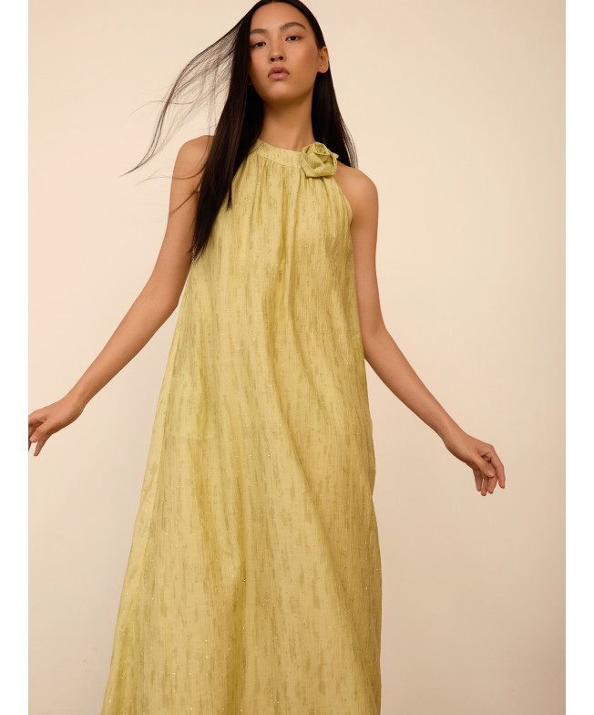 Vestido largo con cuello halter. Detalle de flor del tejido en el cuello. Bolsillos laterales. Cierre detrás con dos botones de nácar.