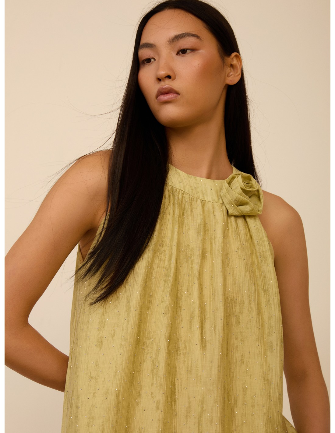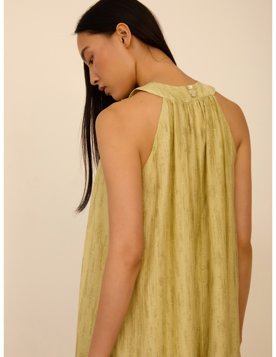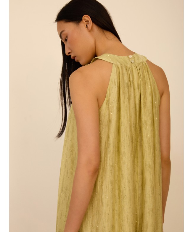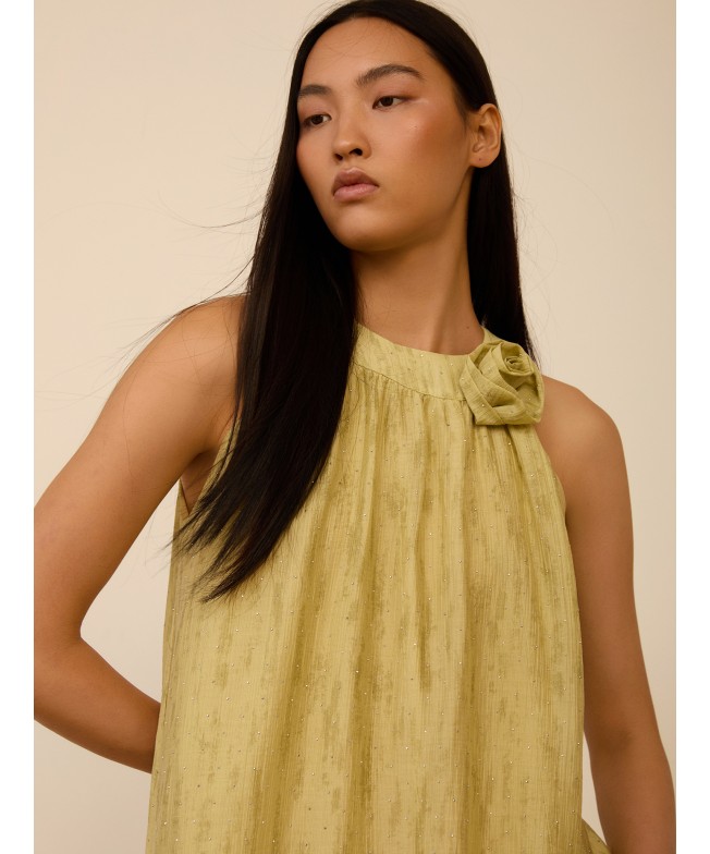 Vestido largo con cuello halter. Detalle de flor del tejido en el cuello. Bolsillos laterales. Cierre detrás con dos botones de nácar.